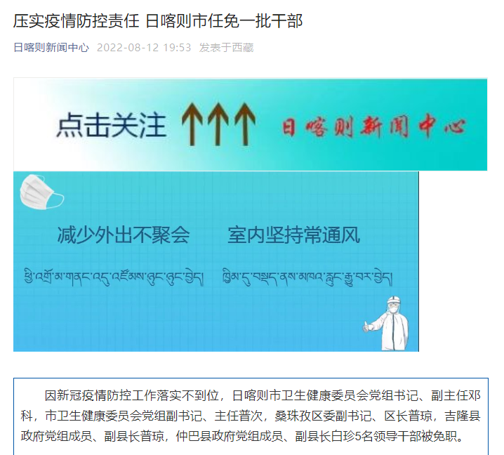 據(jù)日喀則新聞中心微信公眾號消息,因新冠疫情防控工作落實(shí)不到位,日喀則市衛(wèi)生健康委員會黨組書記、副主任鄧科,市衛(wèi)生健康委員會黨組副書記、主任普次,桑珠孜區(qū)委副書記、區(qū)長普瓊,吉隆縣政府黨組成員、副縣長普瓊,仲巴縣政府黨組成員、副縣長白珍5名領(lǐng)導(dǎo)干部被免職。