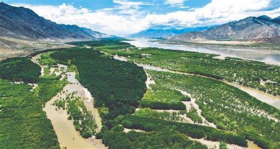 持續(xù)開展國(guó)土綠化行動(dòng),大美西藏生態(tài)持續(xù)良好。截至2021年底,全區(qū)森林覆蓋率達(dá)12.31%,草原綜合植被覆蓋度達(dá)47.53%,全區(qū)環(huán)境空氣質(zhì)量?jī)?yōu)良率達(dá)99.8%,地表水質(zhì)達(dá)標(biāo)率100%。圖為雅魯藏布江山南段沿線通過植樹造林形成的長(zhǎng)160公里、平均寬約1.8公里的綠色長(zhǎng)廊。