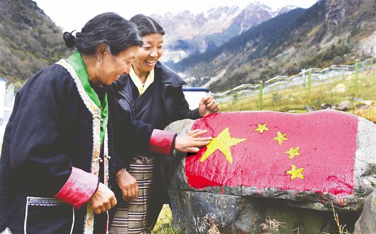 圖為“家是玉麥,國是中國”,人人爭做神圣國土守護(hù)者、幸福家園建設(shè)者。圖為“七一勛章”獲得者卓嘎和同為“時代楷?!钡拿妹醚胱诘诌呇策?。