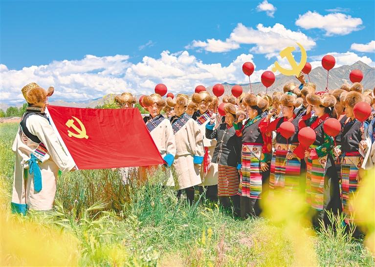圖為黨的光輝照邊疆、邊疆人民心向黨。各族群眾以淳樸而熱烈的形式表達(dá)自己的愛黨愛國情感。圖為2021年7月1日,西藏自治區(qū)貢嘎縣黨員開展慶祝中國共產(chǎn)黨成立100周年“永遠(yuǎn)跟黨走”主題黨日活動。