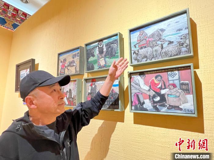 策展人李亞男向中新網(wǎng)記者介紹,崔曉曉首次到西藏那曲便結(jié)識(shí)了一位當(dāng)?shù)嘏笥选麑⑦@位藏族青年放牧、添置汽車(chē)、蓋新房等畫(huà)面用畫(huà)筆記錄了下來(lái),在本次展覽中展出。