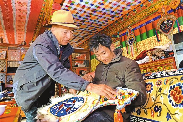 圖為拉薩市非物質(zhì)文化遺產(chǎn)傳承人、墨竹工卡縣達(dá)普林耐傳統(tǒng)服飾制作技藝第五代傳承人加措(左)向徒弟教授面具制作技藝。記者 潘多 攝