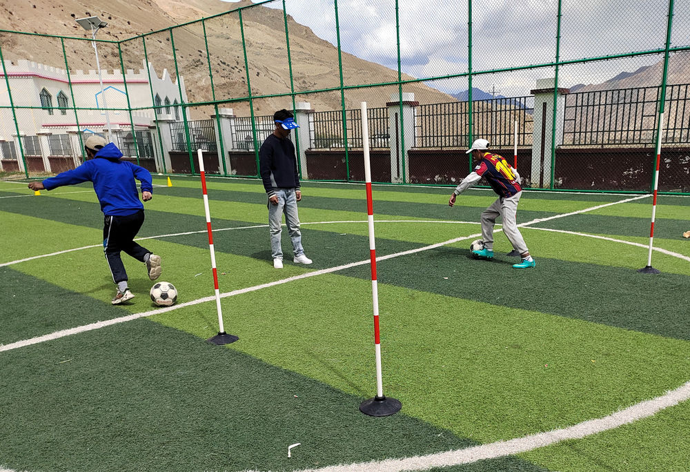 在西藏日喀則市定日縣扎西宗鄉(xiāng)完全小學(xué)的球場(chǎng)上,足球興趣小組的教練普次(中)在指導(dǎo)學(xué)生帶球繞桿(4月21日攝)。新華社發(fā)(白瑪 攝)