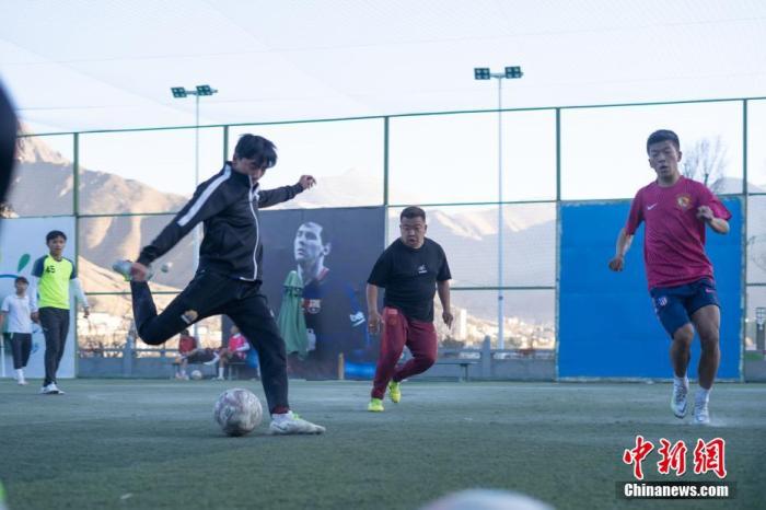 圖為12月12日,拉薩市南環(huán)路室外足球場里,市民正在踢足球比賽。中新社記者 貢嘎來松 攝
