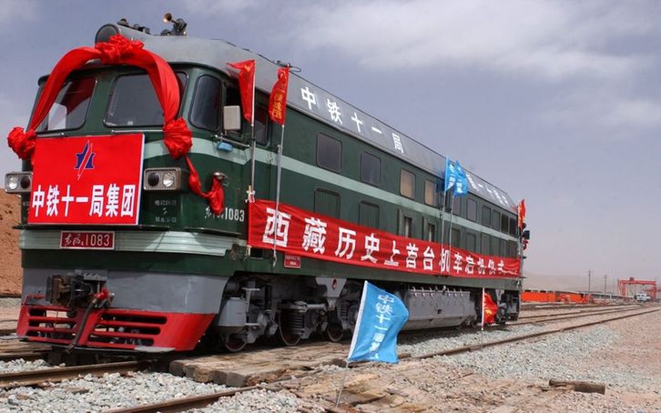 2004年3月23日,在海拔4704米的青藏鐵路海拔最高鋪架基地——西藏安多鋪架基地上,中鐵十一局1083號東風(fēng)4型內(nèi)燃機(jī)車向雪域高原緩緩駛來。這標(biāo)志著西藏歷史上出現(xiàn)了第一臺鐵路機(jī)車。