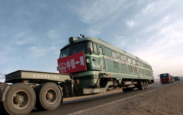 2005年4月19日,一輛汽車上裝著一輛機(jī)車,從青海省格爾木市秀水河車站經(jīng)過青藏公路向西藏安多方向行駛。青藏鐵路建設(shè)總指揮部從2004年3月開始陸續(xù)把近200臺機(jī)車、鋪軌機(jī)、架橋機(jī)、軌道車等大型鋪架設(shè)備用汽車從格爾木安全運(yùn)抵西藏安多,途中翻越海拔5231米的唐古拉山埡口,創(chuàng)造了鐵路建設(shè)史上的奇跡。