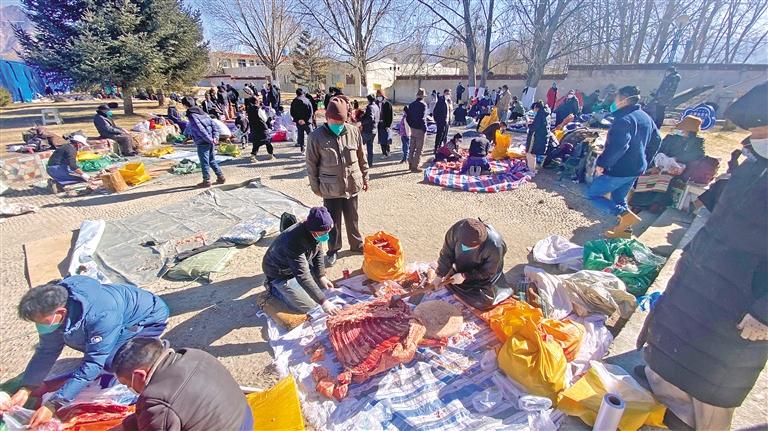 圖為市民在臨時(shí)銷售市場(chǎng)的切肉服務(wù)點(diǎn)處理購買的牛羊肉。記者 格桑倫珠 攝