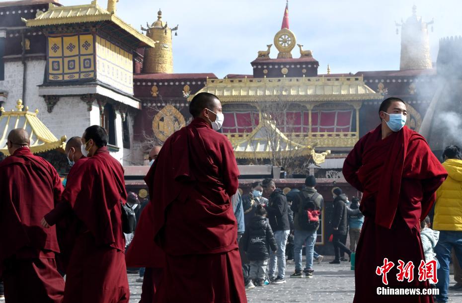 1月12日,西藏拉薩,來自青海玉樹的僧人們正在大昭寺前準備合影留念。 李林 攝