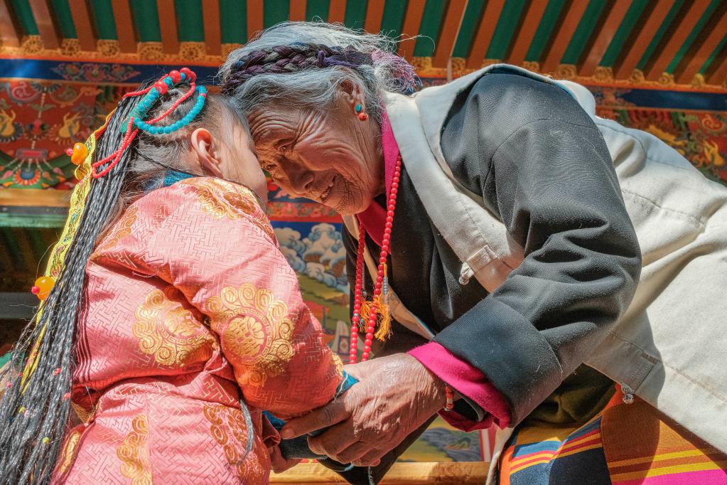 今年,西藏農(nóng)家年和春節(jié)“巧遇”同一天,習(xí)俗雖不同,但年味皆濃。從縣城買來(lái)的年貨,一家人制作的切瑪和卡塞(油炸面食)等傳統(tǒng)供品和食品,紛紛擺上了桌。第四代的孩子們,也換上了嶄新的藏裝,頭戴綠松石點(diǎn)綴的頭飾,依偎在祖奶奶次旦的身旁。