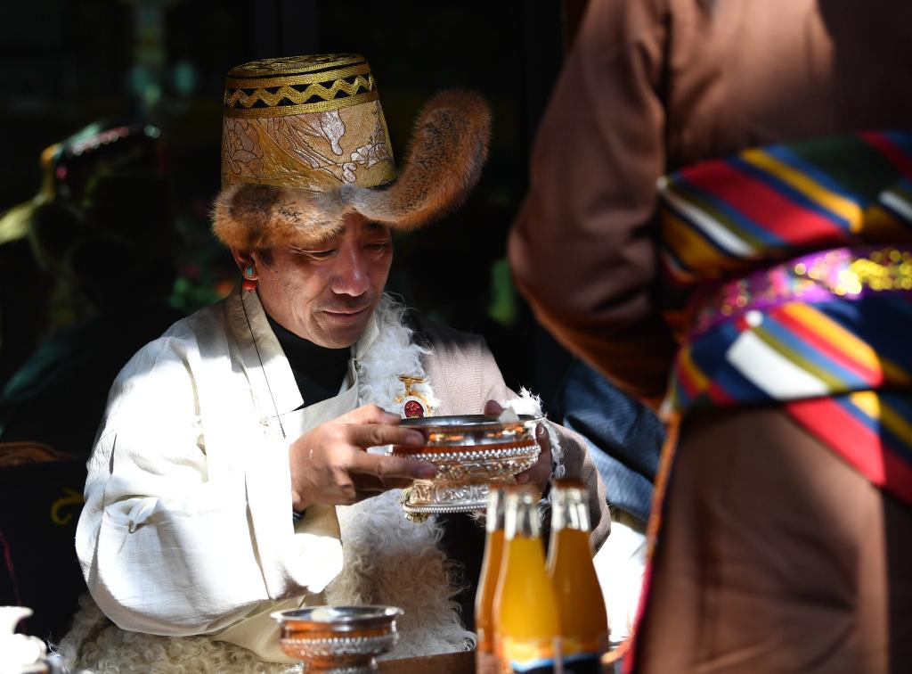 平拉在喝青稞酒。他胸前佩戴的全國(guó)勞模獎(jiǎng)?wù)率撬钫滟F的寶貝(1月22日攝)。新華社記者 晉美多吉 攝