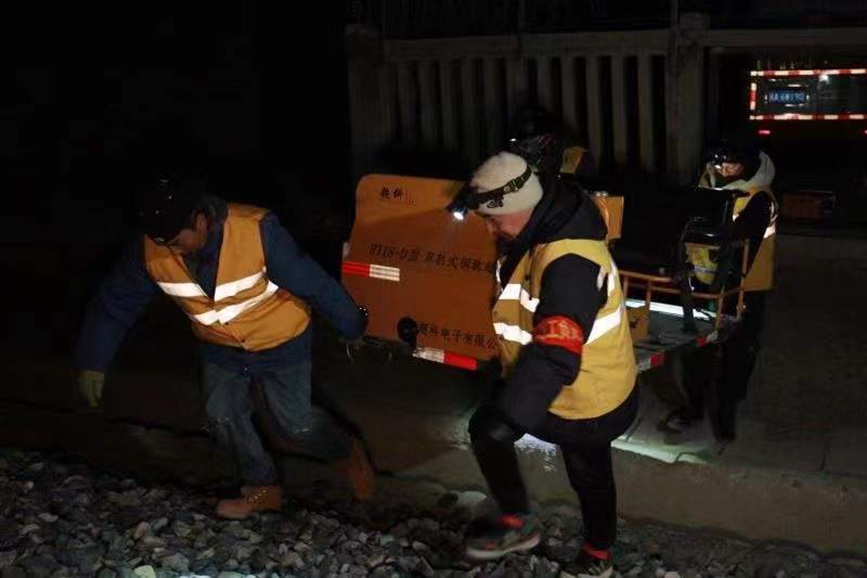 “大家?guī)Ш霉ぞ卟牧?,準備出發(fā)?!?2時整,隨著作業(yè)負責人探傷工區(qū)工長羅布一聲令下,呼嘯的寒風中,黃色的“迷你敞篷車”緩緩啟動,載著4名職工,開始了當晚對拉林鐵路20多公里線路的探傷檢查任務。