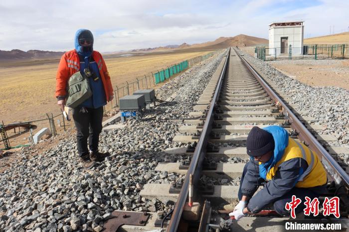 冬季西藏那曲寒風(fēng)凜冽,工長(zhǎng)楊建青(右)加固道岔安裝螺絲?!●R生明 攝