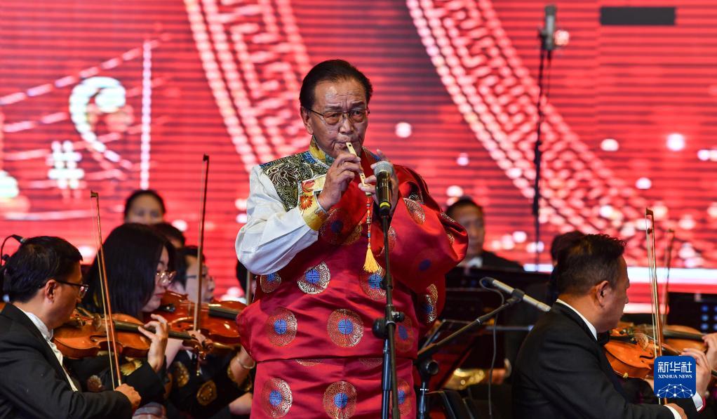 2月18日,演奏家次旦在2023年藏歷新年音樂會上表演鷹笛獨奏《雪域牧歌》。新華社記者 晉美多吉 攝