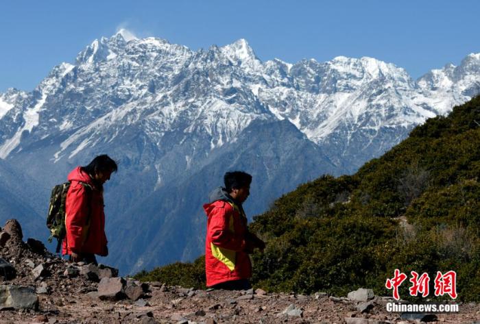 芒康滇金絲猴國家級自然保護區(qū)管護員旦增次措(圖左)與仁青江措(圖右)正在巡邏。李林 攝