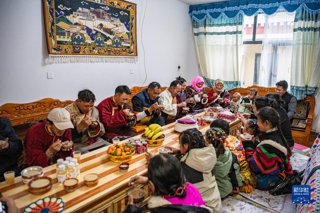 在位于森布日安置點的家中,石秀次仁(左)和家人一起吃“古突”(2月19日攝)。