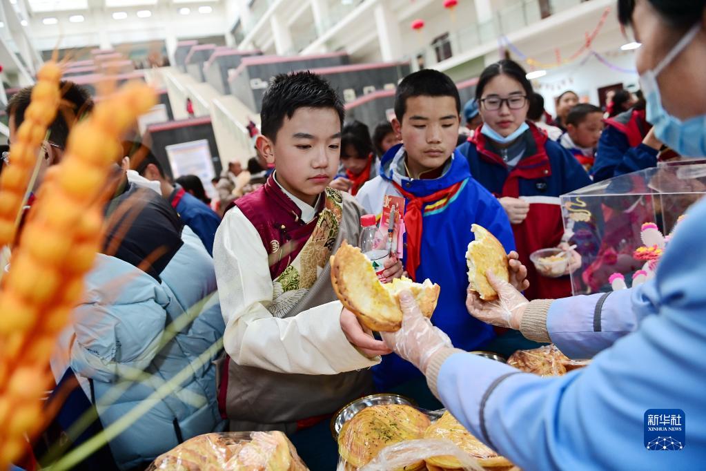 2月21日,在西安市浐灞第一中學(xué)舉行的藏歷新年團(tuán)拜活動上,漢藏學(xué)生品嘗特色小吃。新華社記者 李一博 攝
