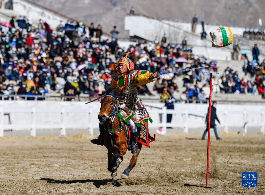 2月23日,在拉薩賽馬場(chǎng)舉辦馬術(shù)表演已成為當(dāng)?shù)貞c祝新年的傳統(tǒng),深受廣大群眾喜愛(ài)。騎手們英姿颯爽,為觀眾們帶來(lái)騎馬拾哈達(dá)、騎馬射箭等精彩表演。