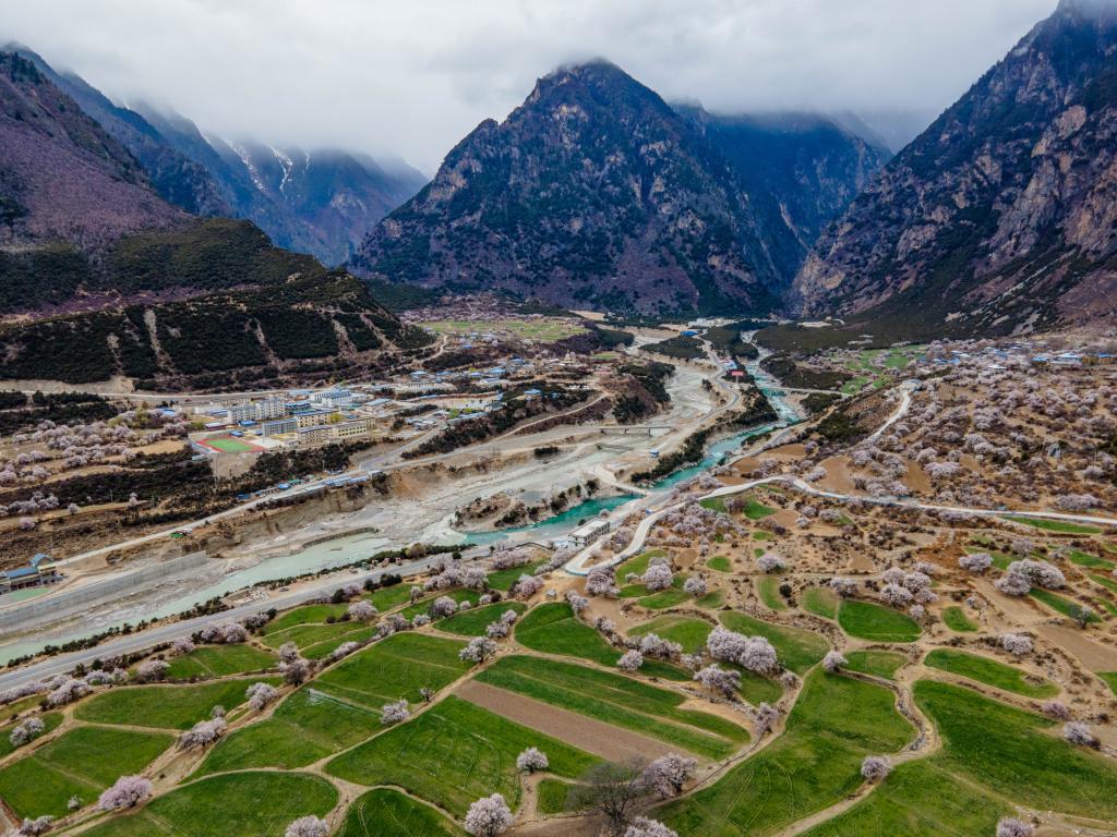 在西藏那曲市嘉黎縣尼屋鄉(xiāng)拍攝的桃花(無人機(jī)照片,2022年3月21日攝)。新華社記者周荻瀟 攝