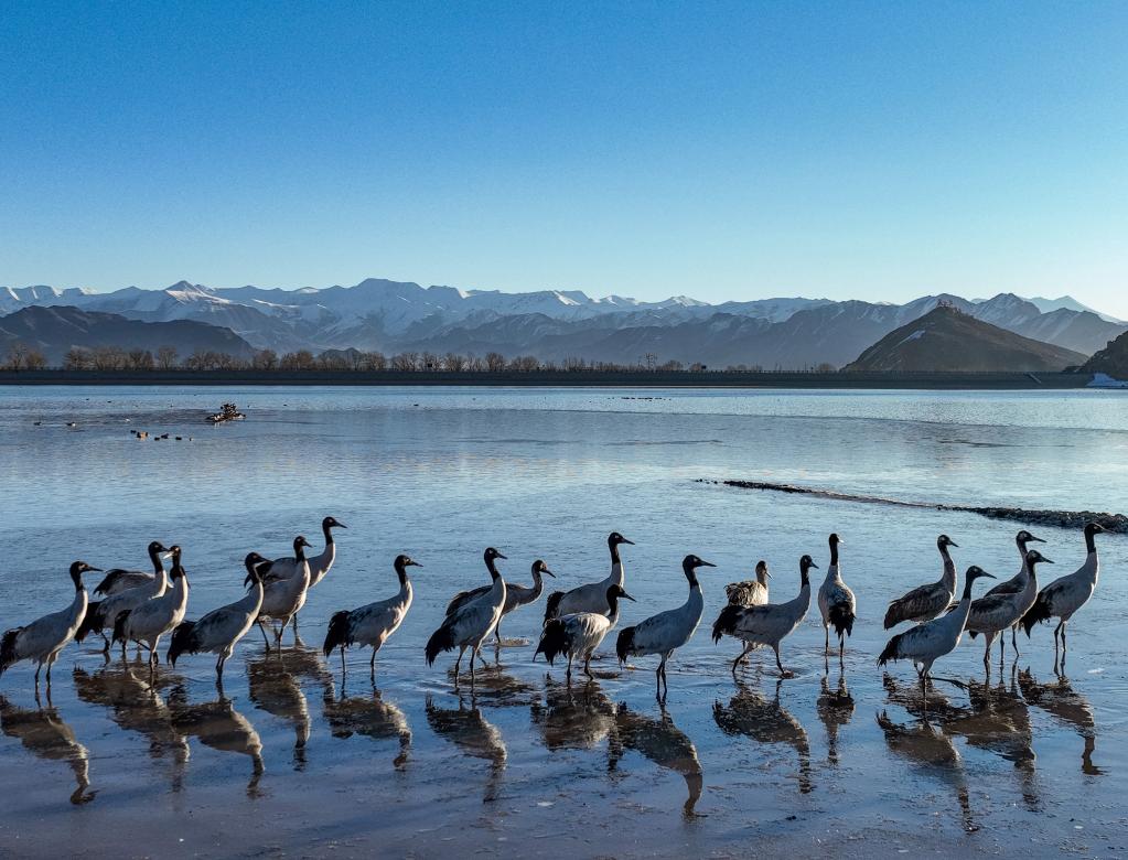 黑頸鶴是國(guó)家一級(jí)保護(hù)動(dòng)物,主要棲息在海拔2500米至5000米的高原、草甸、沼澤地帶。拉薩北部的林周縣平均海拔約4200米,是黑頸鶴的主要越冬地之一。