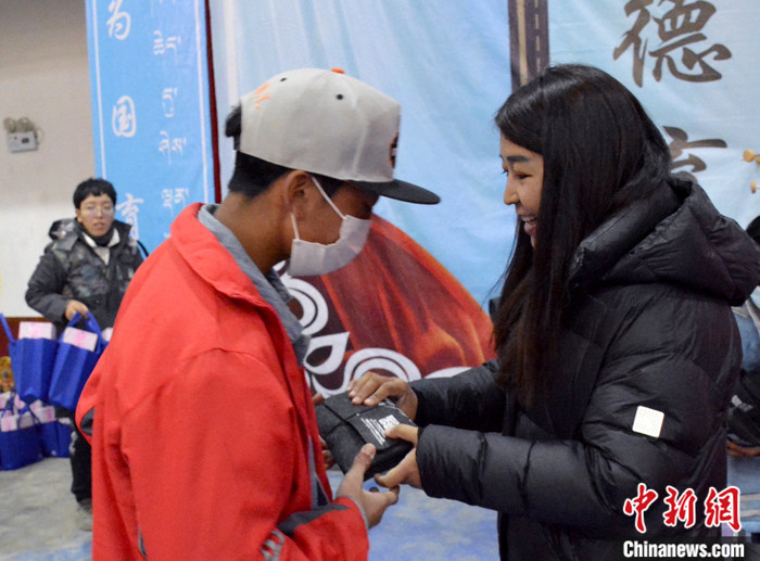 2021年,西藏那曲公益捐贈(zèng)活動(dòng)中,德慶玉珍(右)為青少年兒童送上成長愛心包。(資料圖片) 受訪者 供圖