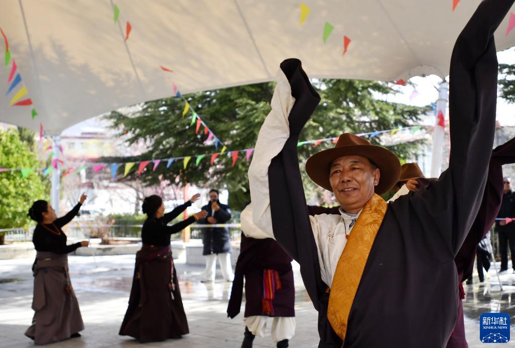 3月28日,拉薩西郊安居苑藏族群眾慶祝西藏百萬(wàn)農(nóng)奴解放64周年。新華社發(fā) (覺果 攝)
