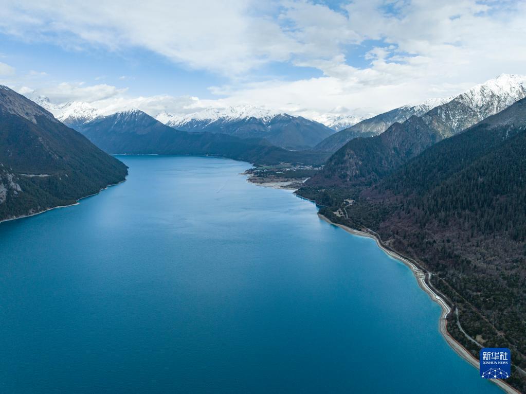 這是4月15日拍攝的巴松錯(cuò)風(fēng)光(無(wú)人機(jī)照片)。新華社記者 孫非 攝