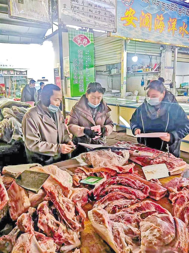 圖為拉薩市有關工作人員深入市場,查看糧油菜肉蛋奶等商品價格、供應情況。