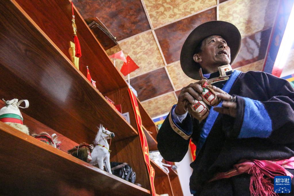 索朗群培展示他制作的工藝品馬包(4月18日攝)。新華社記者 聶毅 攝