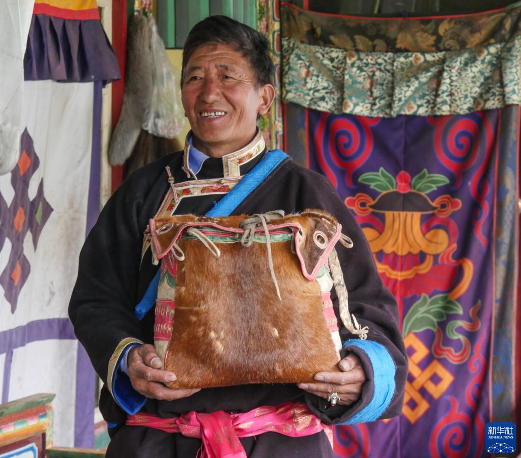 索朗群培展示他制作的馬包(4月18日攝)。新華社記者 劉洲鵬 攝