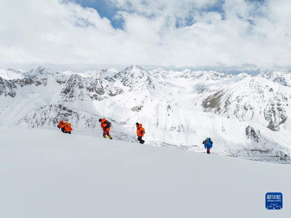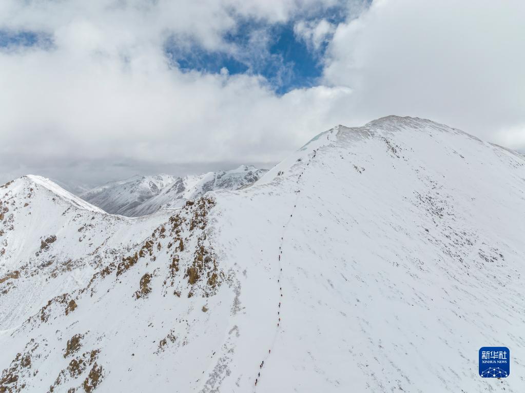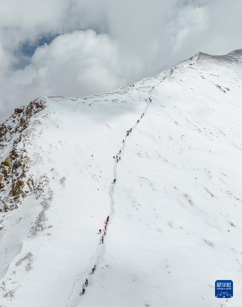 5月3日,登山愛好者正在向海拔6010米的洛堆峰峰頂進(jìn)發(fā)(無(wú)人機(jī)照片)。新華社記者 孫非 攝