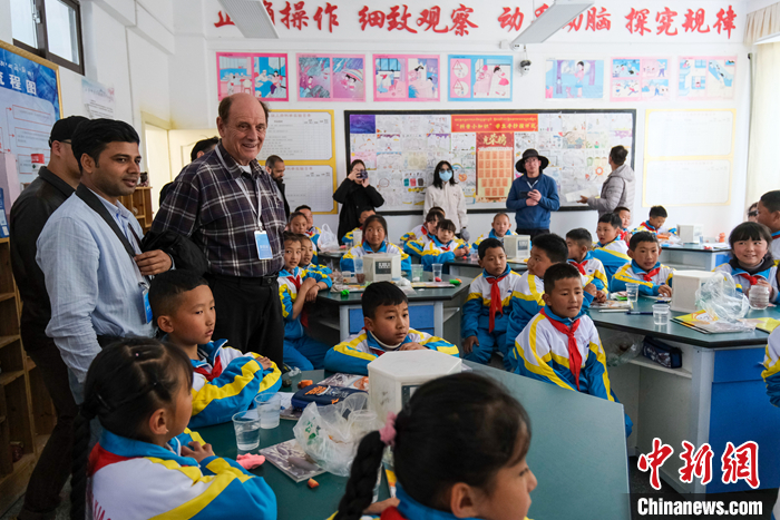 圖為5月18日上午,參訪團成員在林芝市第二小學(xué)觀看孩子們上實驗課。中新社記者 江飛波 攝
