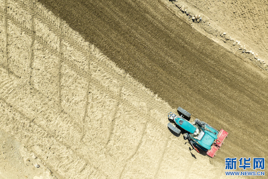 5月12日,西藏定日縣扎西宗鄉(xiāng)巴松村的村民在犁地(無(wú)人機(jī)照片)。 新華網(wǎng) 旦增努布 攝