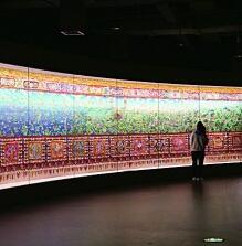 唐卡藏語(yǔ)意為“卷軸畫(huà)”,常見(jiàn)的唐卡作品長(zhǎng)寬都在1米左右,這幅長(zhǎng)618米的巨幅唐卡尺寸之大,實(shí)屬罕見(jiàn)。整幅作品由金銀、珊瑚、瑪瑙、珍珠、綠松石等純天然礦物配制的顏料繪制而成,上下裝飾的堆繡圖案達(dá)3000多種。藏文化博物院用四層整層對(duì)其進(jìn)行了完整展示,蜿蜒曲折的展線讓人仿佛徜徉于歷史長(zhǎng)河。
