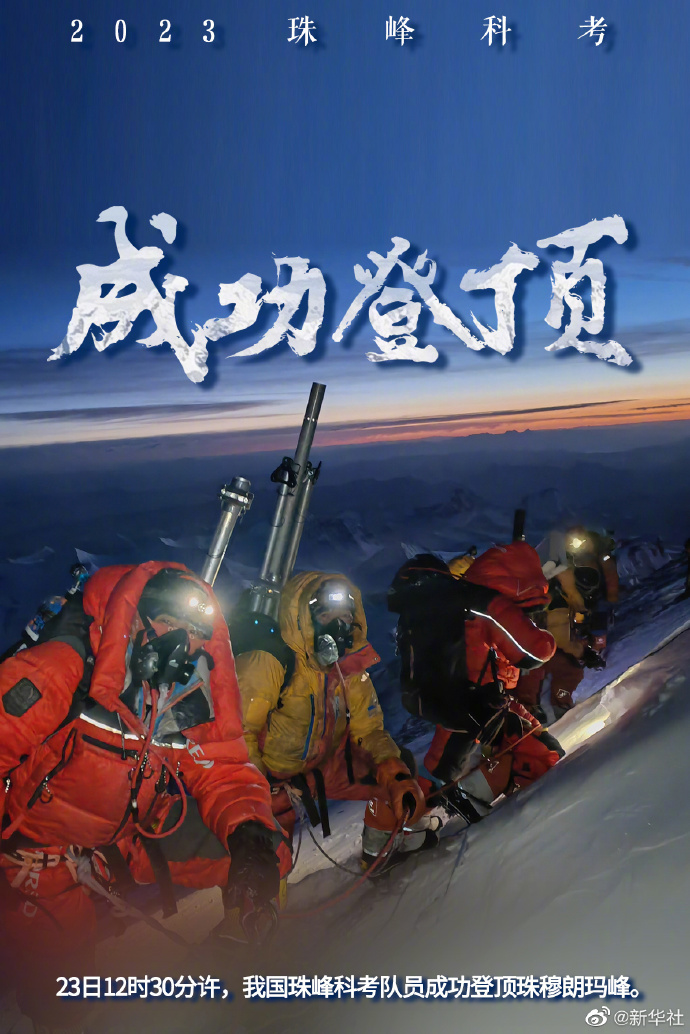 23日12時30分許,2023年珠峰科考13名登頂隊員成功登頂?shù)厍蛑畮p珠穆朗瑪峰。之后,他們將完成峰頂雪冰樣品采集等重要科考任務。