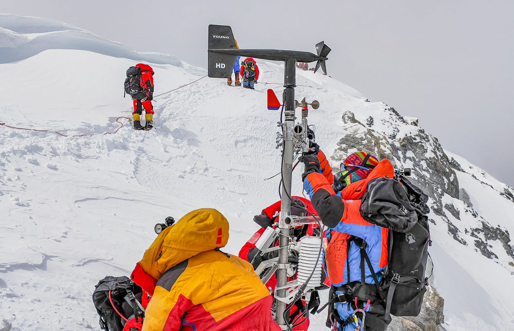 當日凌晨3時,科考隊員從海拔8300米的突擊營地出發(fā),歷經(jīng)數(shù)小時攀登,終于抵達海拔8830米的世界最高自動氣象觀測站。固定鋼筋繩索,更換蓄電池,安裝風(fēng)速風(fēng)向傳感器……經(jīng)過約1小時的緊張工作,氣象站零部件升級工作全部完成。隨后,他們攀登至8848.86米的峰頂,利用工具成功采集雪冰樣品。