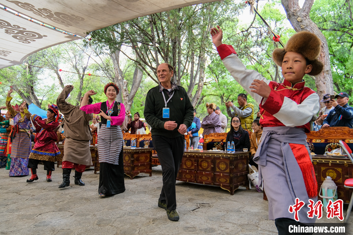 圖為5月19日,柯馬凱在拉薩羅布林卡聽藏戲,和當(dāng)?shù)夭刈迕癖娨坏捞伹f舞。中新社記者 江飛波 攝