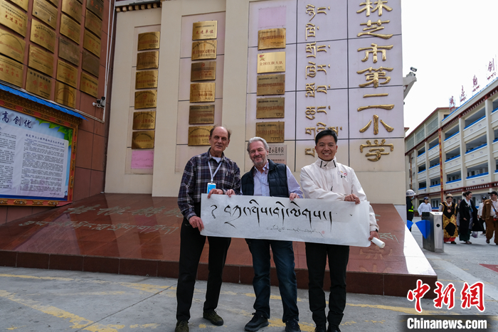 圖為5月18日,柯馬凱(左一)在林芝市第二小學(xué)參訪時獲得學(xué)校贈予的藏文書法作品“扎西德勒”。中新社記者 江飛波 攝