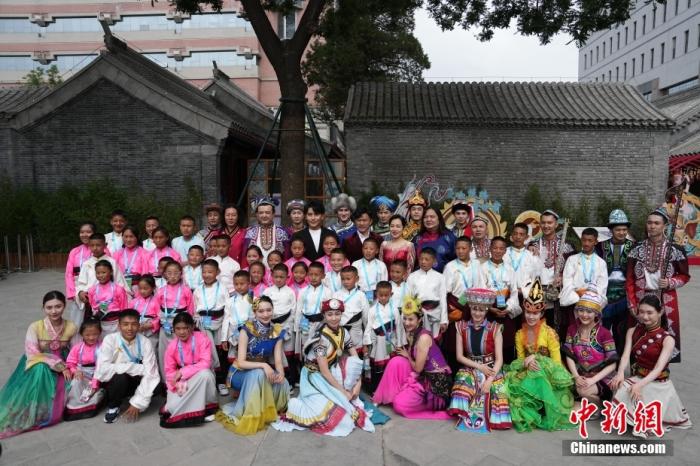 6月1日,來(lái)自青海省玉樹藏族自治州兒童福利院的40名藏族青少年參觀中華民族共同體體驗(yàn)館。圖為孩子們與參加演出的多民族藝術(shù)家們合影。中新社記者 崔楠 攝