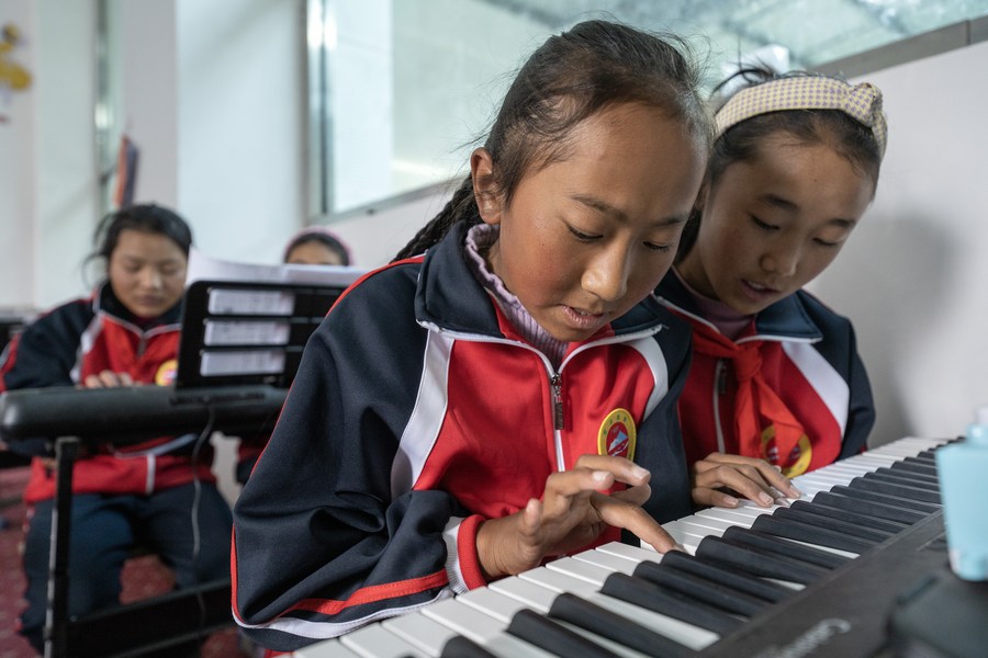 6月5日,扎西宗鄉(xiāng)完全小學(xué)的學(xué)生在上鋼琴課。