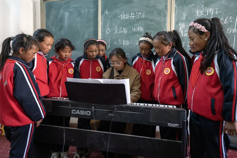 6月5日,扎西宗鄉(xiāng)完全小學(xué)的鋼琴課老師巴桑(右)在給學(xué)生指導(dǎo)指法。