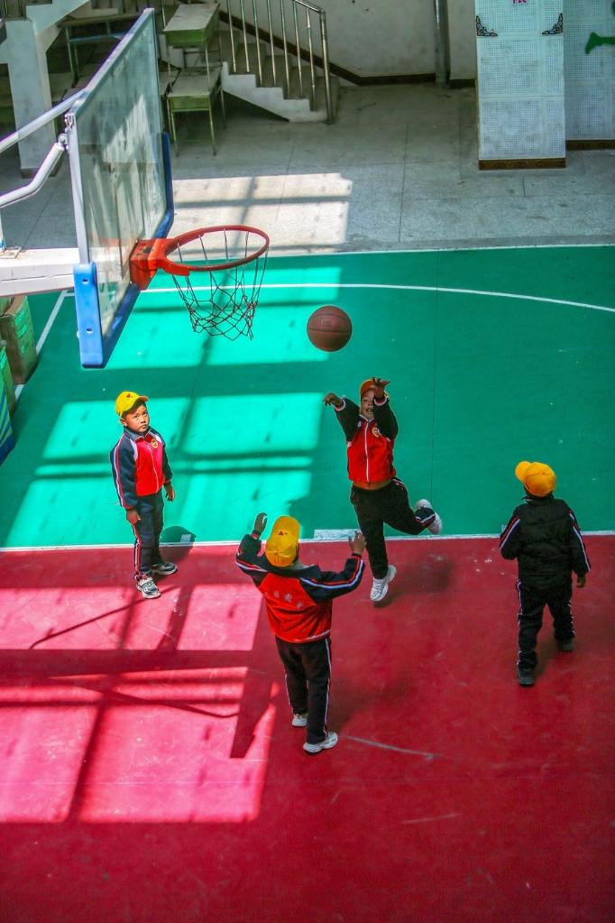 6月5日,扎西宗鄉(xiāng)完全小學(xué)的學(xué)生在室內(nèi)體育館上籃球課。
