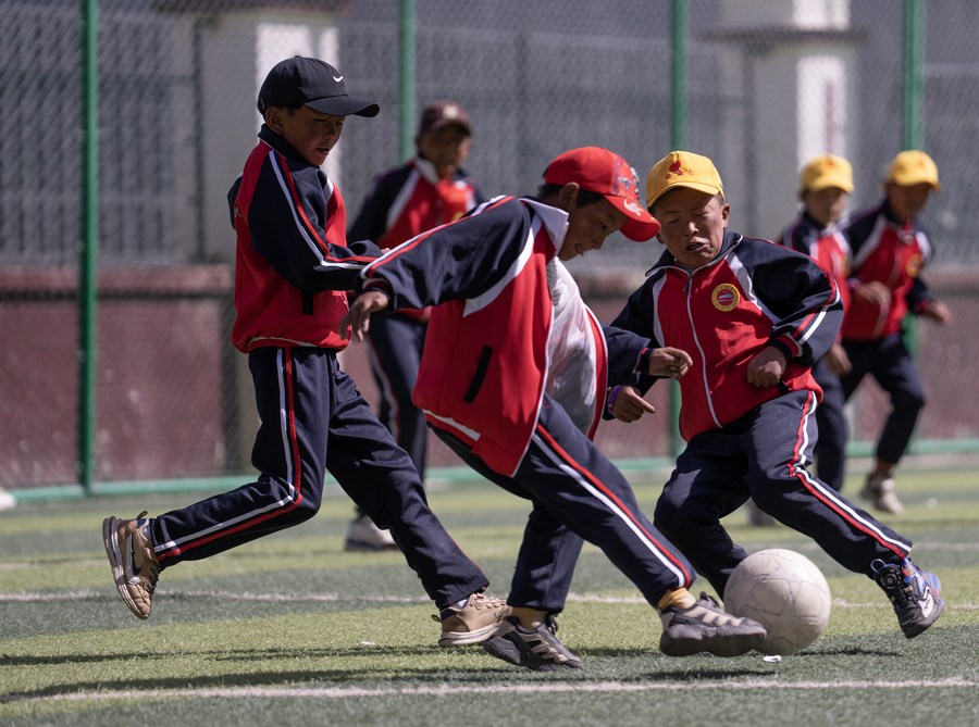 6月5日,扎西宗鄉(xiāng)完全小學(xué)的學(xué)生在人工草坪上踢足球。