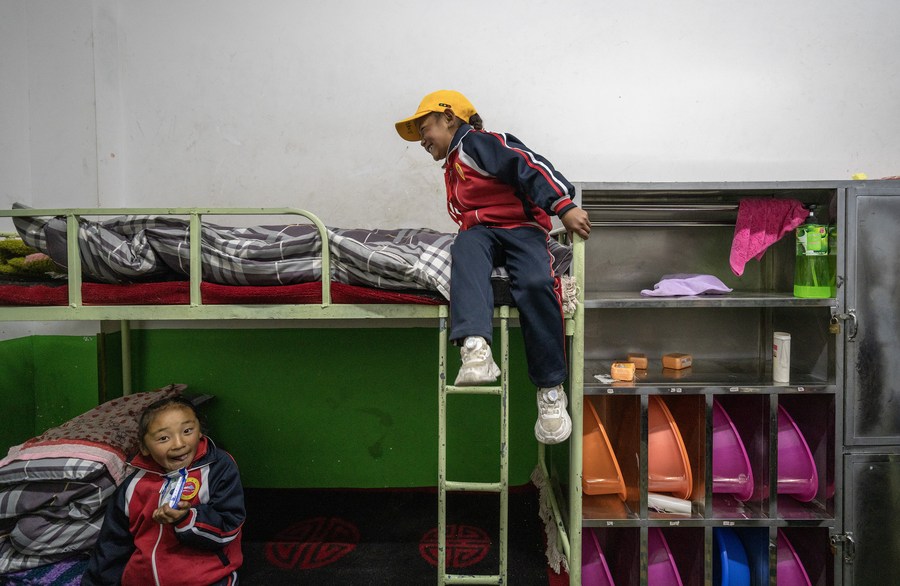 6月5日,扎西宗鄉(xiāng)完全小學(xué)的學(xué)生在宿舍準(zhǔn)備就寢。