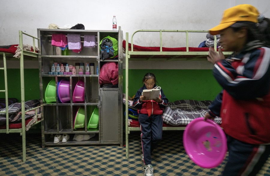 6月5日,扎西宗鄉(xiāng)完全小學(xué)學(xué)生在宿舍看書。