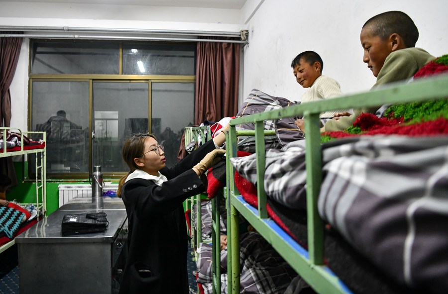 扎西宗鄉(xiāng)完全小學(xué)的值班老師在檢查孩子睡覺時(shí)是否蓋好被子(6月5日攝)。