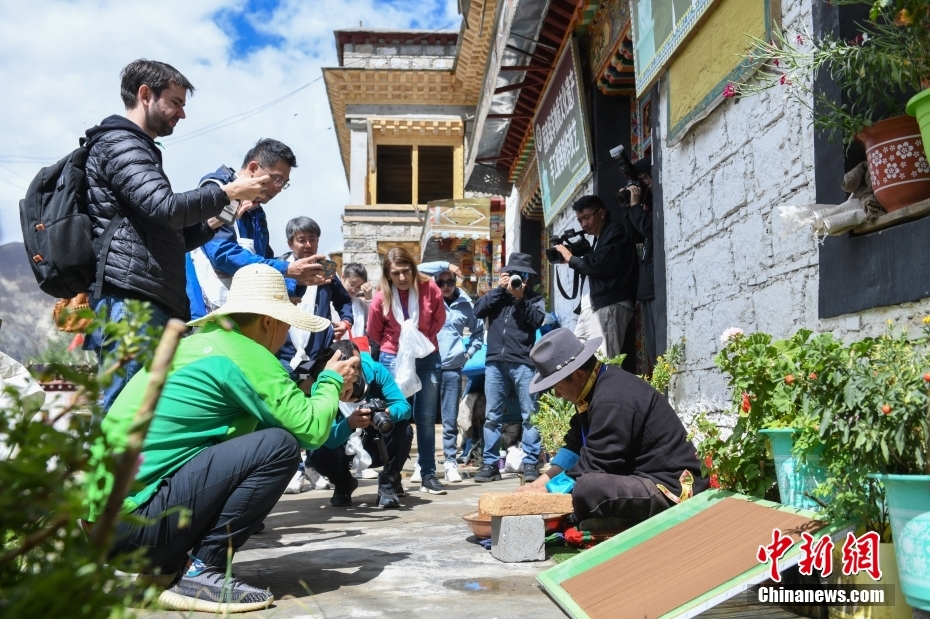 6月15日,西藏拉薩,記者們?cè)谀崮究h非遺工坊(藏紙制作廠)采訪拍攝。在第五屆中國(guó)西藏旅游文化國(guó)際博覽會(huì)召開(kāi)之際,國(guó)務(wù)院新聞辦組織中外媒體記者赴西藏采訪,路透社、共同社、西班牙埃菲社、意大利安莎社、新加坡《聯(lián)合早報(bào)》和中央廣電總臺(tái)、中國(guó)日?qǐng)?bào)等15家媒體的20名記者參加。6月15日,采訪團(tuán)一行前往拉薩市尼木縣參訪體驗(yàn)西藏傳統(tǒng)藏香、藏紙文化。