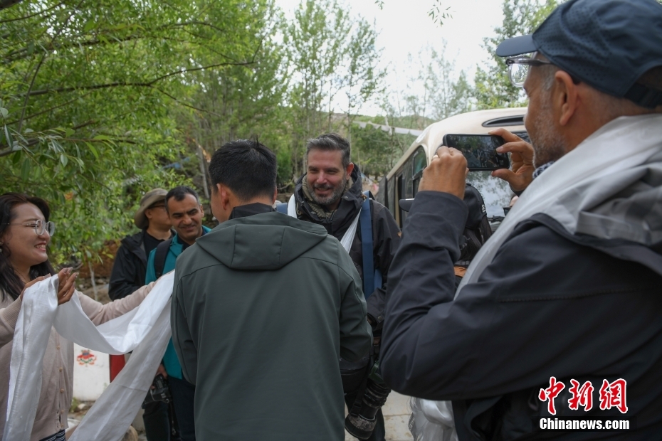 6月15日,西藏拉薩,尼木縣吞巴鎮(zhèn)吞達(dá)村村民給來(lái)訪記者們敬獻(xiàn)哈達(dá),表示歡迎。在第五屆中國(guó)西藏旅游文化國(guó)際博覽會(huì)召開(kāi)之際,國(guó)務(wù)院新聞辦組織中外媒體記者赴西藏采訪,路透社、共同社、西班牙埃菲社、意大利安莎社、新加坡《聯(lián)合早報(bào)》和中央廣電總臺(tái)、中國(guó)日?qǐng)?bào)等15家媒體的20名記者參加。6月15日,采訪團(tuán)一行前往拉薩市尼木縣參訪體驗(yàn)西藏傳統(tǒng)藏香、藏紙文化。