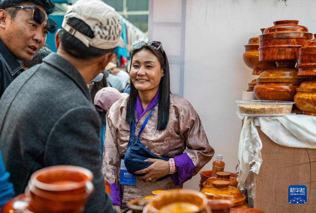 在第五屆藏博會現(xiàn)場,來自不丹的參展商旺楚克·澤帕(左一)跟顧客交談(6月18日攝)。新華社記者 孫非 攝