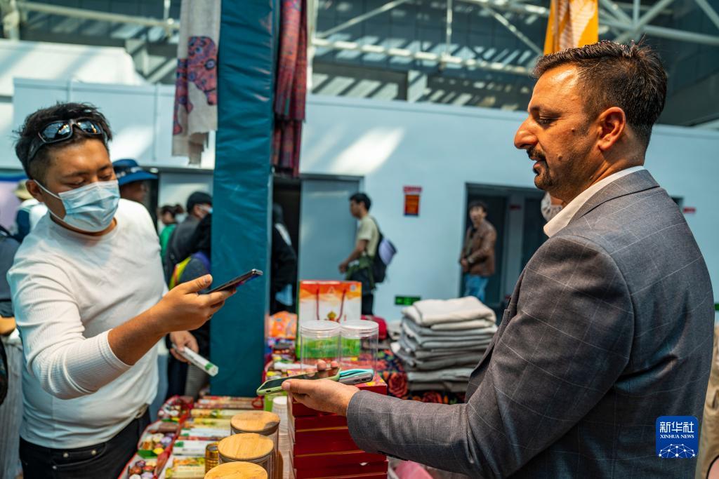 在第五屆藏博會現(xiàn)場,來自印度的參展商伊納亞特·艾哈邁德·汗(右)使用二維碼收款(6月17日攝)。新華社記者 孫非 攝
