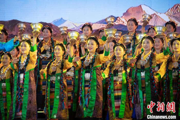 開幕式上,由300架無人機組成的暖場表演在日喀則珠峰文化旅游創(chuàng)意產(chǎn)業(yè)園區(qū)上空精彩呈現(xiàn),組成“珠峰故里、吉祥日喀則,歡迎您!”等陣型。匠心獨運的創(chuàng)意設(shè)計,流光溢彩的聲光電效果,以恢弘氣勢和華麗造型,展示日喀則的開放包容。文藝表演由序《珠峰頌歌》、上篇《戀上青稞》、下篇《極境暢想》和尾聲《吉祥日喀則》組成。聲,是情的流露;舞,是意的表達。文藝演出將民眾的生活與藝術(shù)相結(jié)合,融合傳統(tǒng)文化與現(xiàn)代歌舞等藝術(shù)形式,既富有傳統(tǒng)特色又極具時代魅力,將日喀則各族人民的喜悅和游情盡情抒發(fā),充分表達了日喀則各族人民對美好生活的熱愛和對祖國的祝福歌頌。